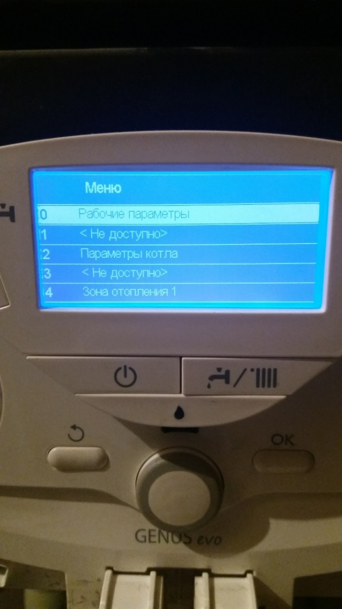 После нажатие двух кнопок для входа в меню, мы видим на экране данное меню, выбираем колесиком "параметры котла" и нажимаем "ОК".