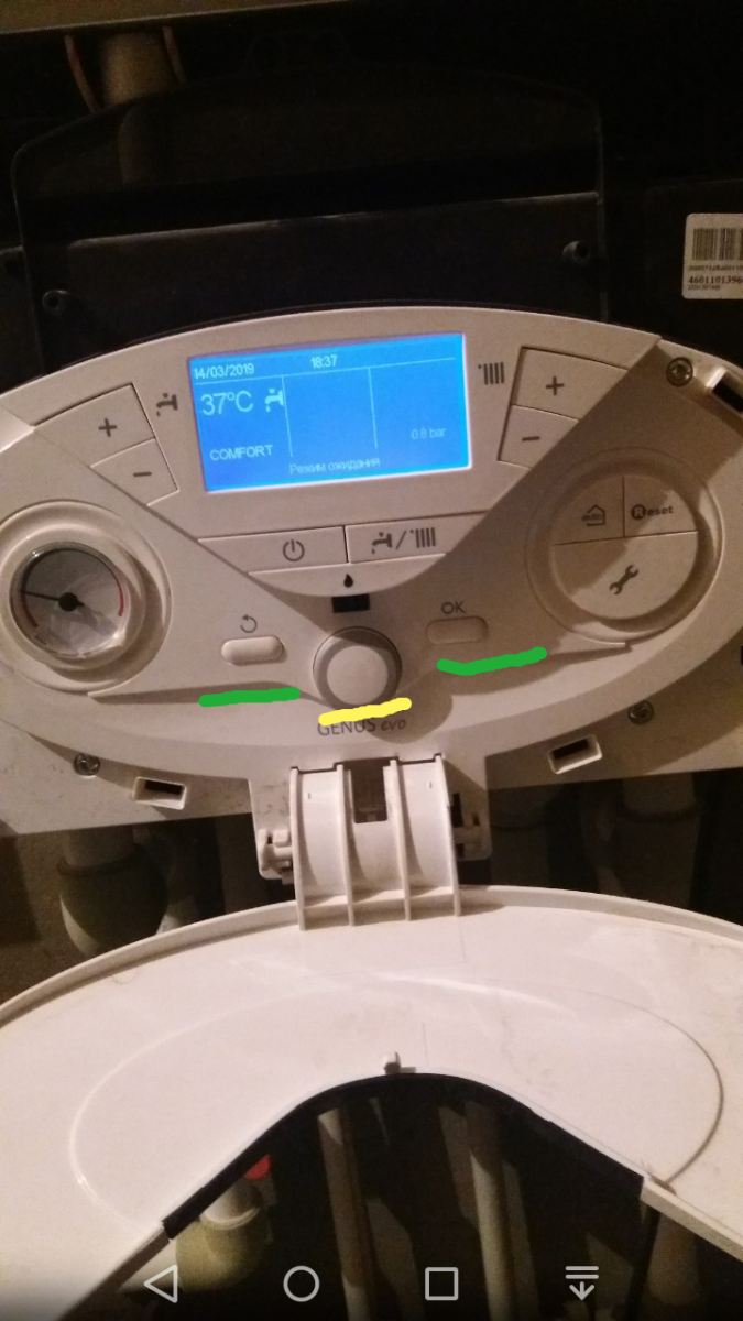 На фото мы видим две нижнии кнопки (помеченые зеленым) для входа в меню неообходимо их зажать одновременно на 5 секунд. Левая кпопка это "выход с меню", а правая "ОК" (вход в сервисные параметры).Между этих кнопок есть колесико для выбора нужного параметра в меню.